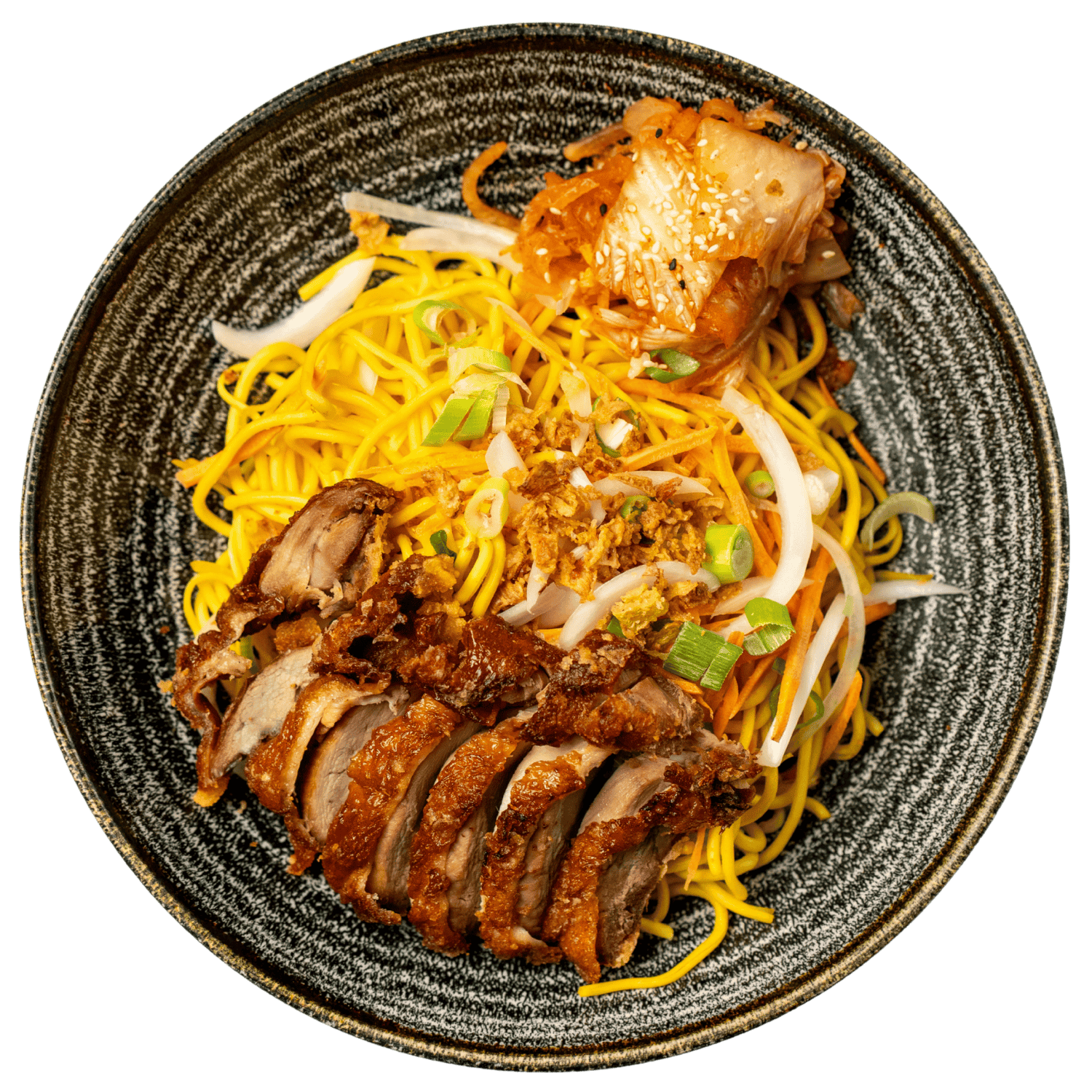 Gebratene Nudeln, Gemüse, Ei, Röstzwiebeln – separat Kimchi (scharf)