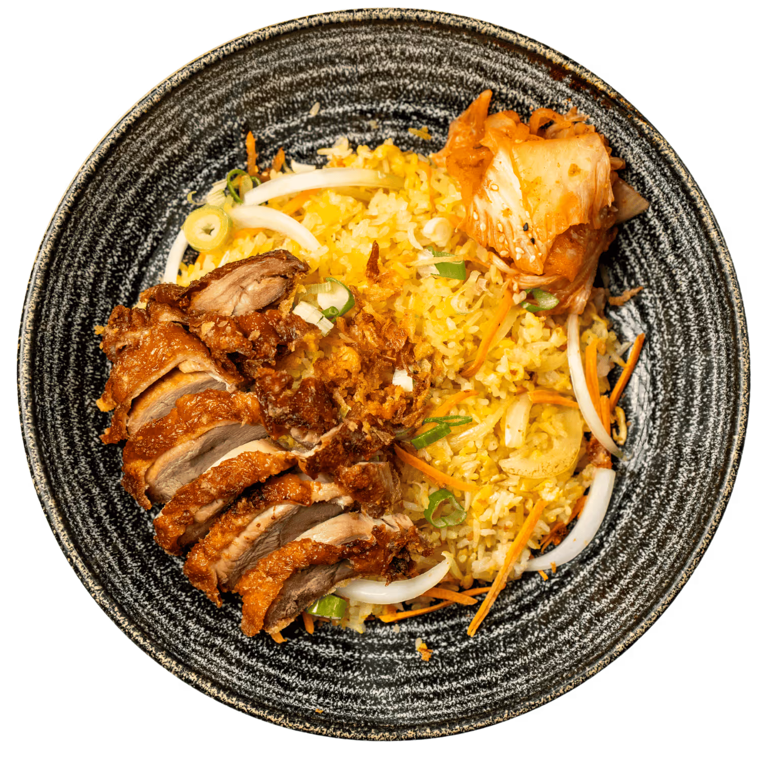 Wok-gebratener Reis, Gemüse, Ei, Röstzwiebeln – separat Kimchi (scharf)