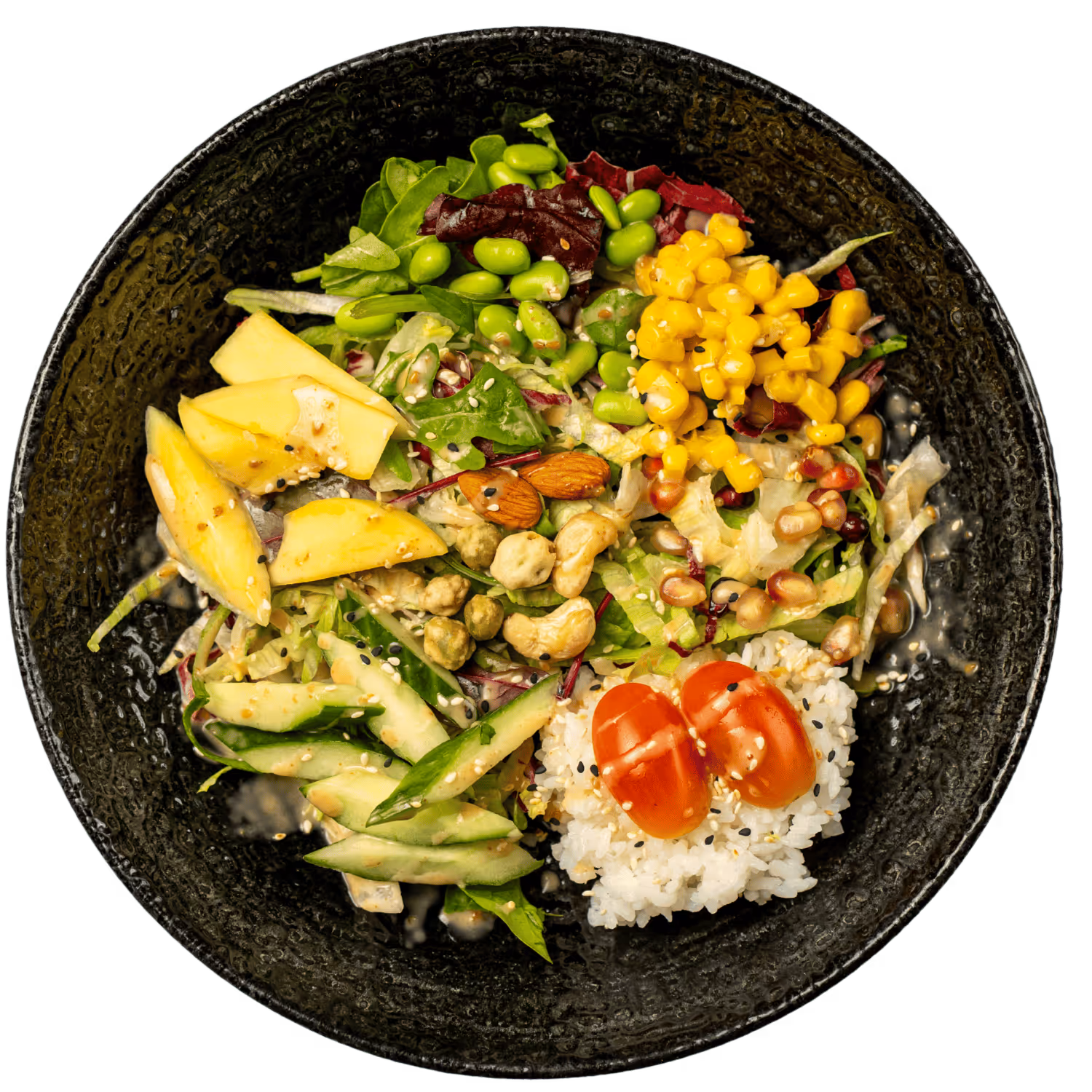 Wahlweise mit Tofu / +1,00 € pan. Huhn / +1,00 € Rind / +1,00 € Gyoza 3 Stk. (veg./Huhn)