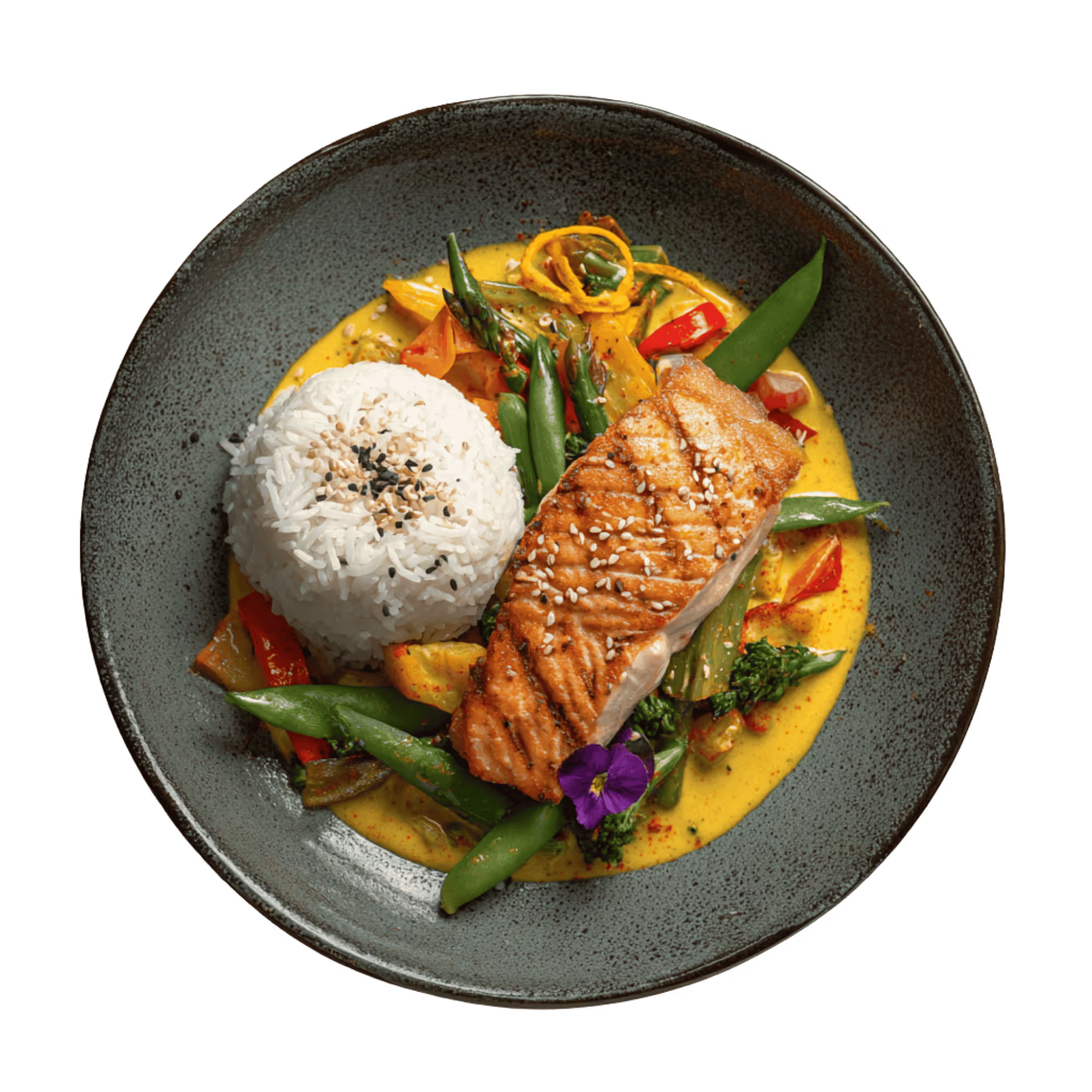 Gegrilltes Lachsfilet mit Gemüse und Jasminreis wahlweise in gelbem Thai Curry / Pepper n Garlic Soße